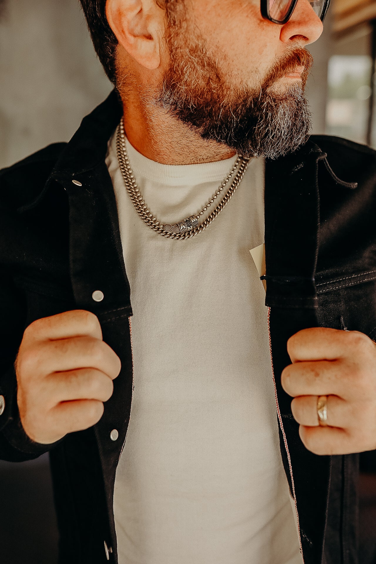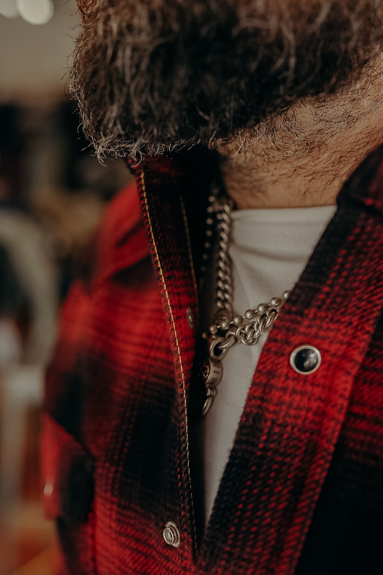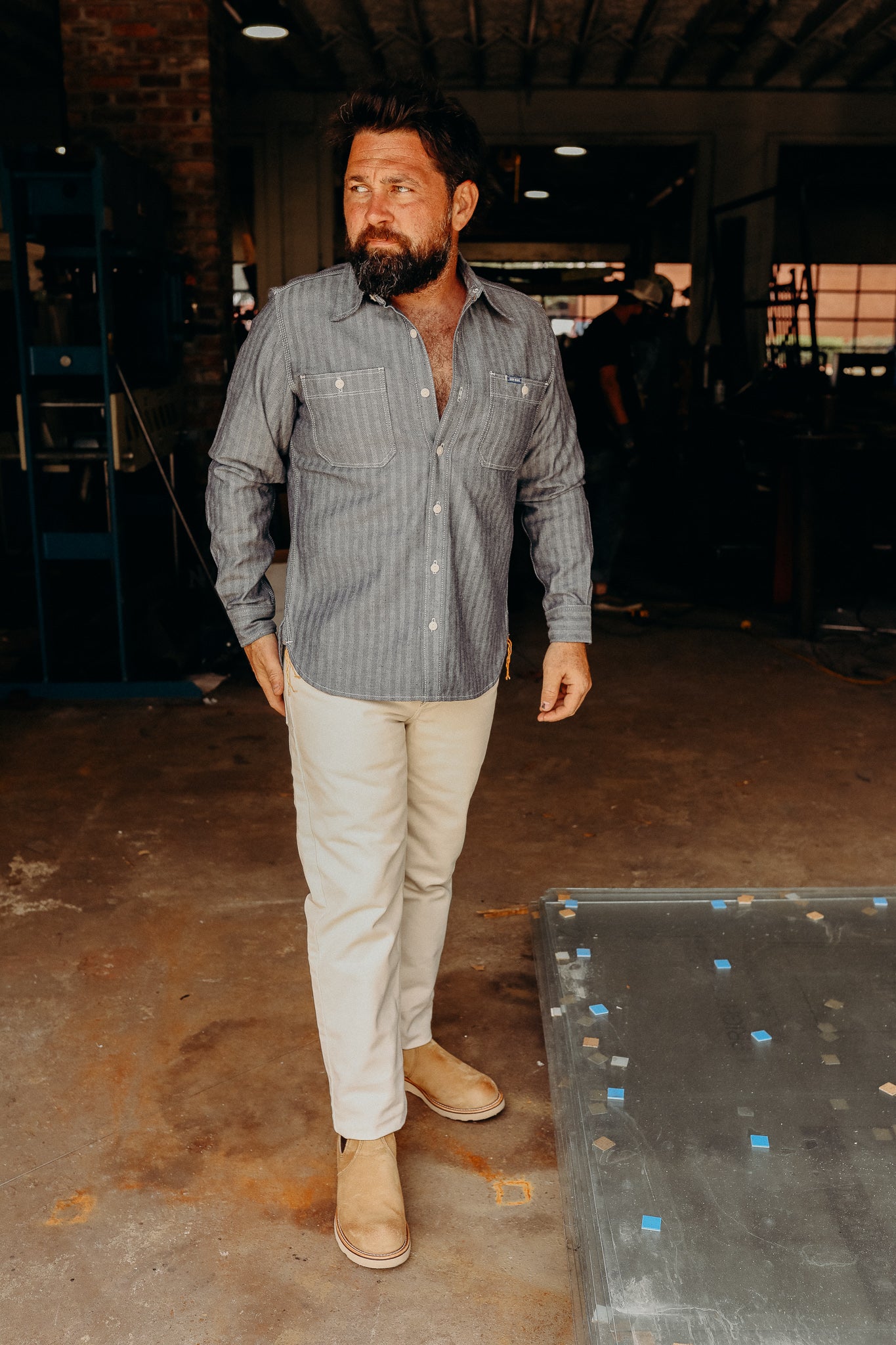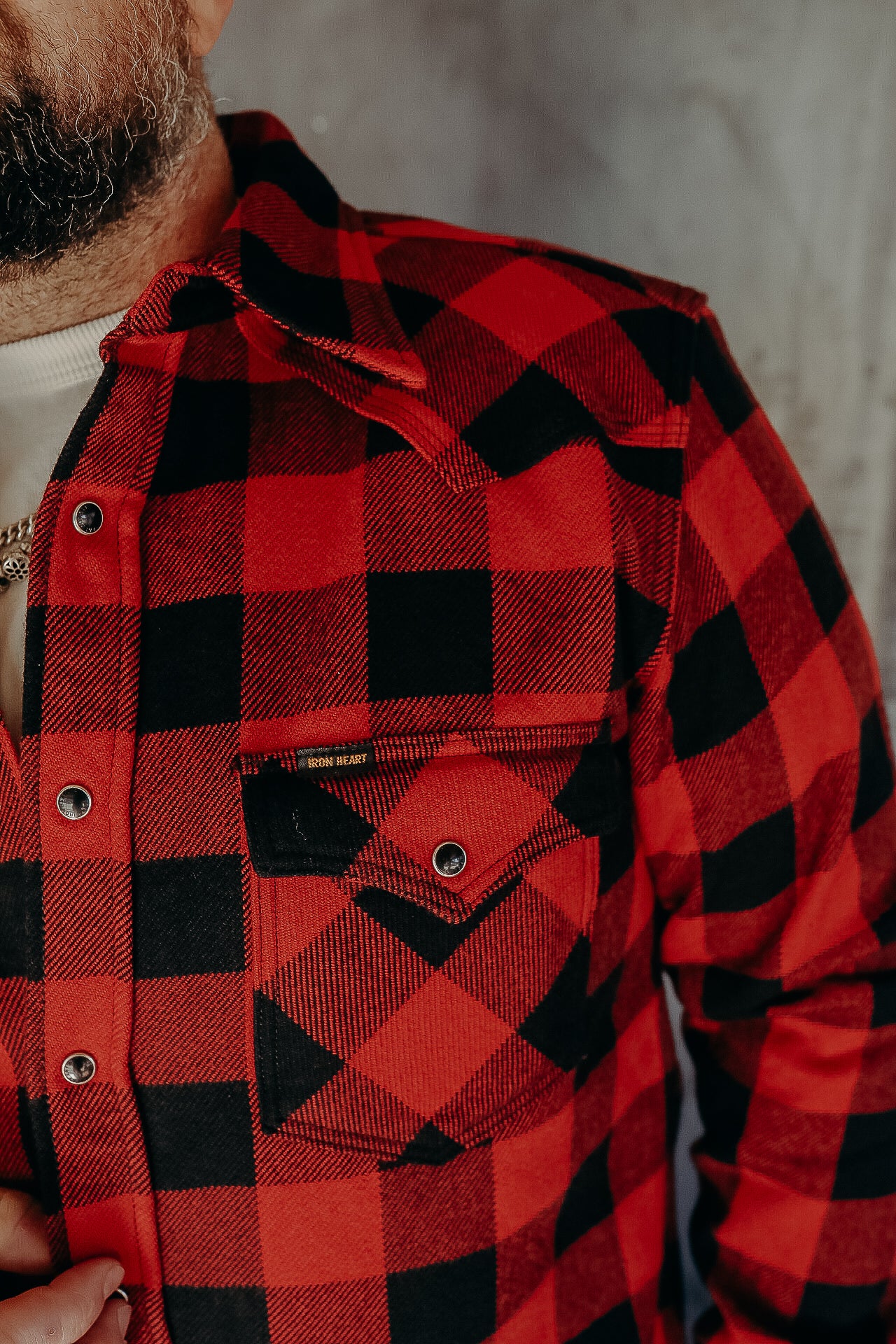 Originally designed with bikers in mind, Iron Heart's focus on durable and robust clothing continues to influence its design and construction. Haraki-san ensures that the garments meet the preferences of riders, while also appealing to a broader audience. Most Iron Heart pieces are crafted from heavyweight fabrics to provide durability and some level of protection for motorcyclists. The brand uses classic materials and styles, including flannels, denim, and chambrays for shirts, and draws inspiration from military and traditional riding jackets for its outerwear. Notably, some designs, such as the 25oz XHS (extra heavy selvedge) denim jeans, push the limits of what can be woven and sewn, embodying their philosophy of "over-engineered is our starting point."