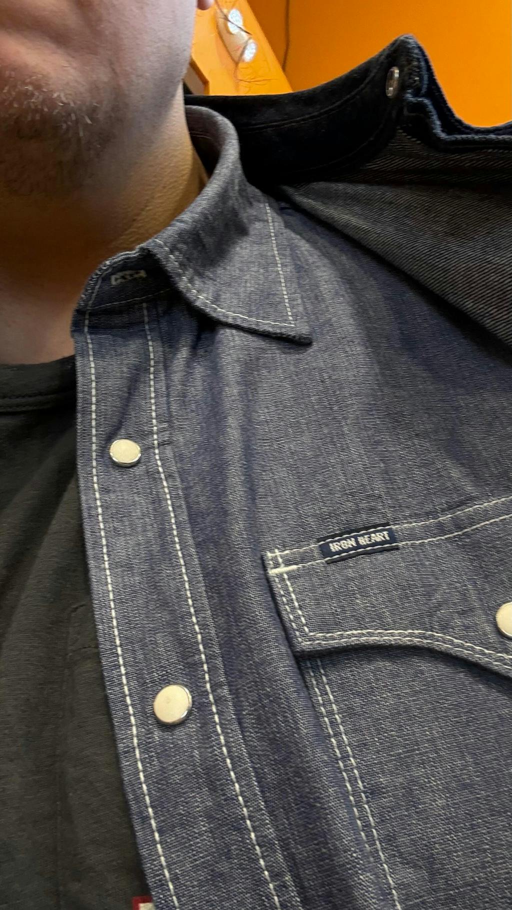 Iron Heart's single yoke western shirt in a 10oz blue selvedge chambray. The warp has been reactive dyed so that the color will remain consistent season in and season out. Finished with a triple chain stitch construction and white snaps.